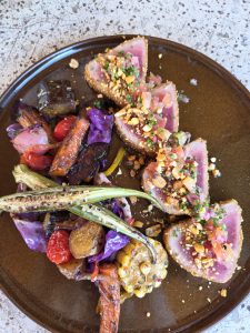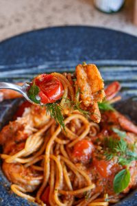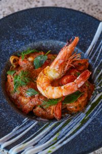 Iniciamos nossa jornada com o impecável Atum Selado, semi-cru em uma deliciosa crosta de milho torrado. A textura e o sabor fresco do atum, com o toque crocante do milho, são uma combinação sublime. Em seguida, nos deliciamos com o Spaghetti com Camarões, um prato que exalta a leveza e aroma do azeite dill e a cremosidade do queijo fresco, com camarões suculentos.