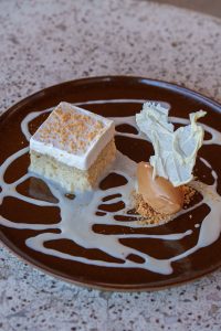 E para finalizar, as sobremesas: Os Churros chegam em quatro unidades generosas, no estilo mexicano, acompanhados por um chantilly de doce de leite, caldas de chocolate meio amargo e branco, e um irresistível toffee de caramelo salgado. Uma tentação! O Três Leches é uma releitura encantadora: bolo de baunilha molhadinho, espuma de leite, chocolate branco assado e telha de nata. Uma sobremesa equilibrada, que mescla o conforto do “bolo de vovó” com a sofisticação da alta gastronomia.
