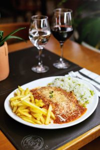 O clássico Filé à Parmegiana Volpi continua sendo o grande destaque. Preparado com cortes selecionados e molho artesanal, vem acompanhado de arroz com brócolis e batatas fritas, um prato generoso e cheio de sabor.